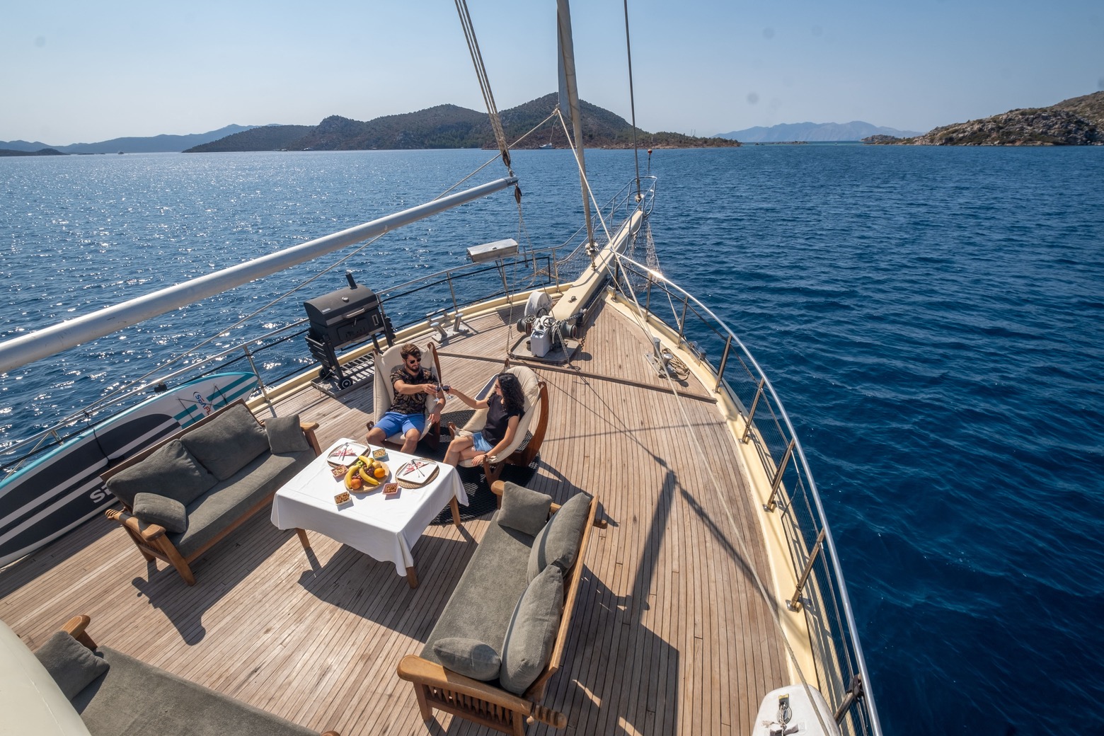 From Symi, we sail back to Turkish waters and drop anchor in the bay of Bençik. This is a quiet and protected anchorage surrounded by pine foresting. Bençik is located in the narrow part of the peninsula which separates the Gulf of Hisaronu from the Gulf of Gokova. Just a bit further is the bay of Aktur. According to many, this is the most beautiful bay of Turkey. Far from the busy touristic places, you can enjoy the silence and take a dip in the clear blue sea.Â